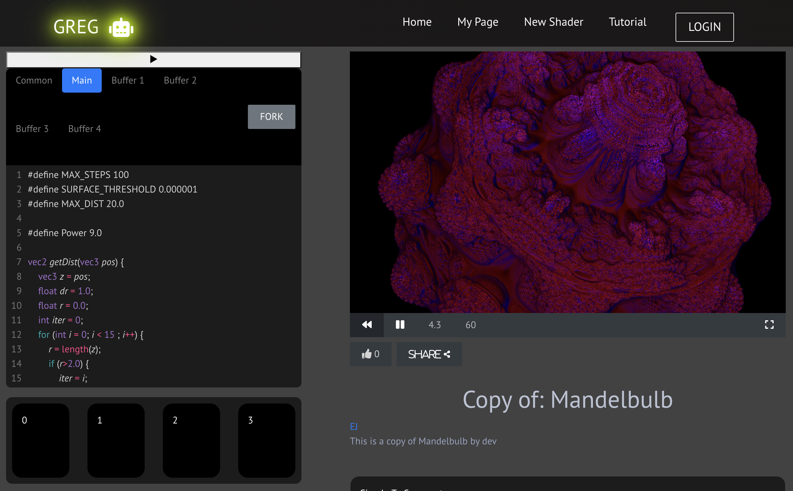 Implemented an integrated shader IDE, supporting C syntax highlighting, 4 buffer and 4 texture slots, and an interactive shader preview window (including FPS/elapsed time, play/pause/restart, and fullscreen functionalities)